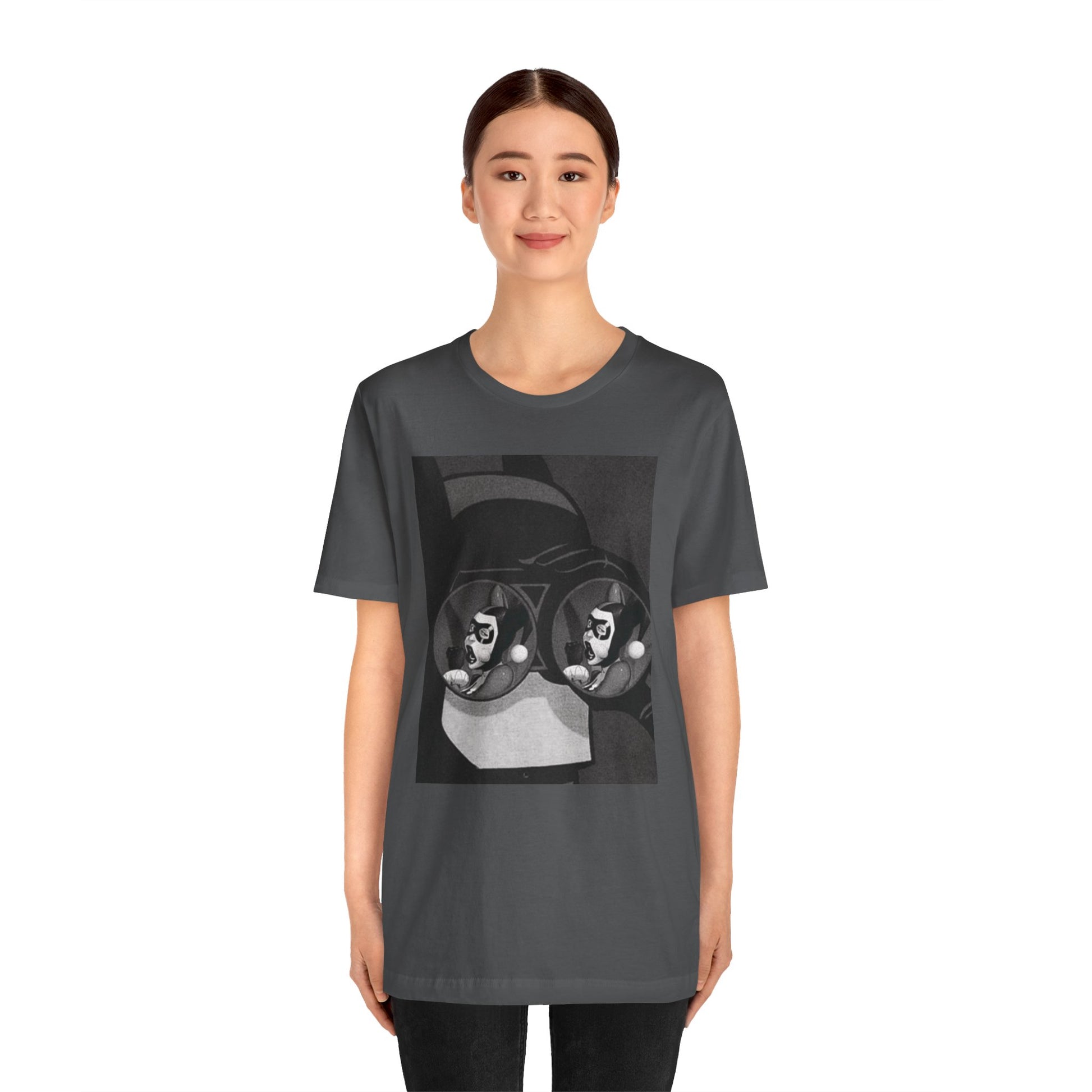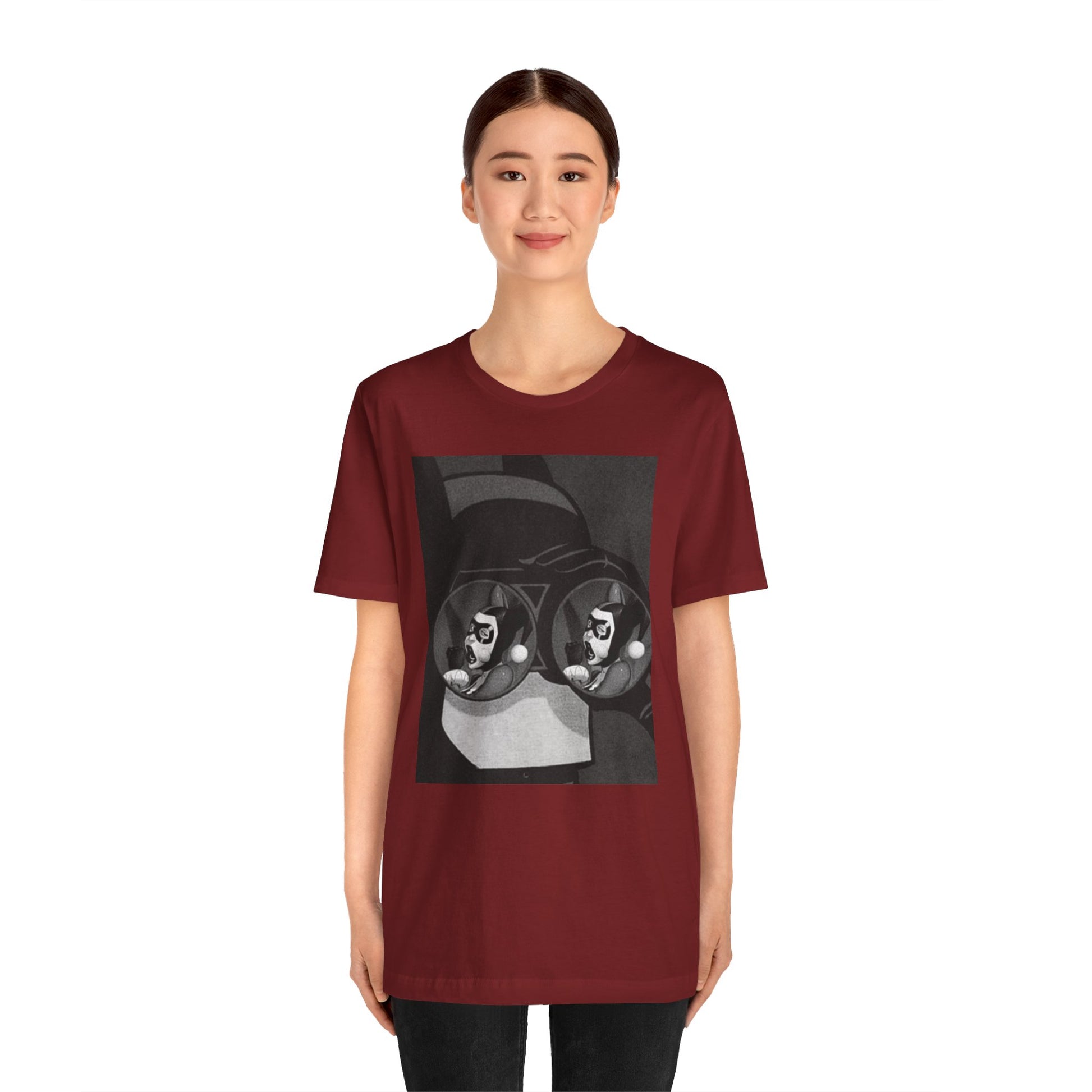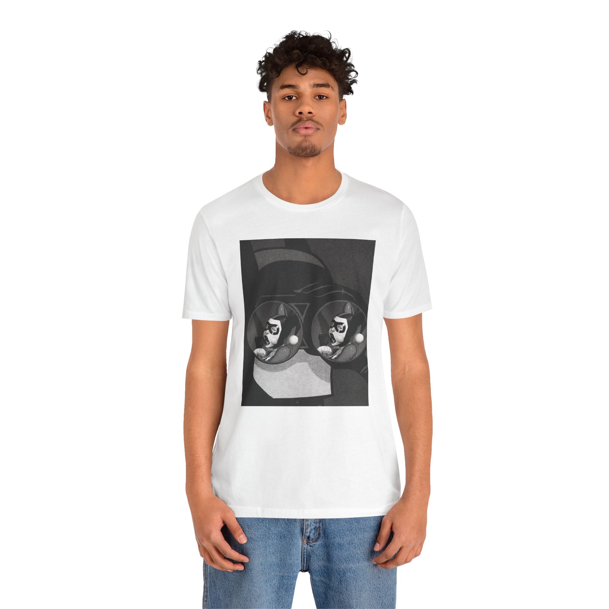 A soft, breathable tee with a moody black-and-white art print that feels like a page torn from a graphic novel. The design—two mirrored faces reflected in round lenses—pulls you into a quiet, slightly surreal moment. Lightweight Airlume cotton keeps the shirt comfortable all day, while the retail fit and crew neckline make it easy to dress up with a jacket or keep casual with jeans. Wear it when you want your outfit to feel thoughtful, lived-in, and a little secretive.