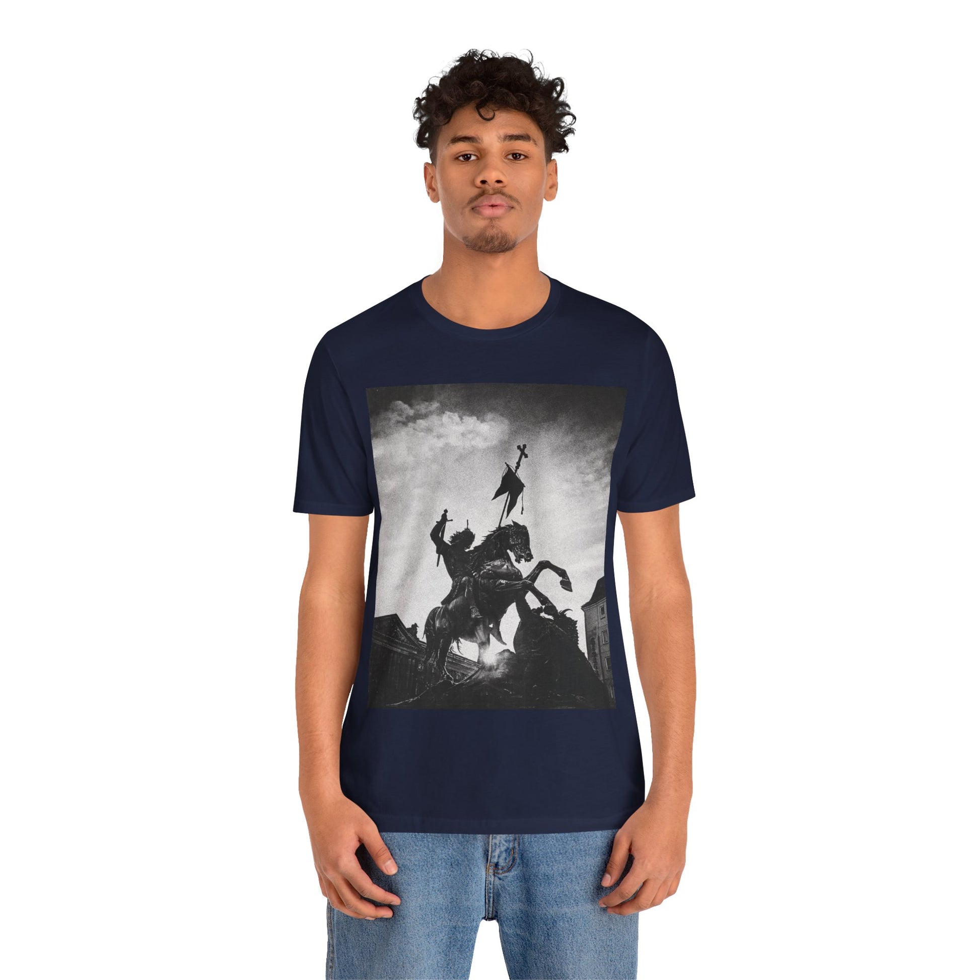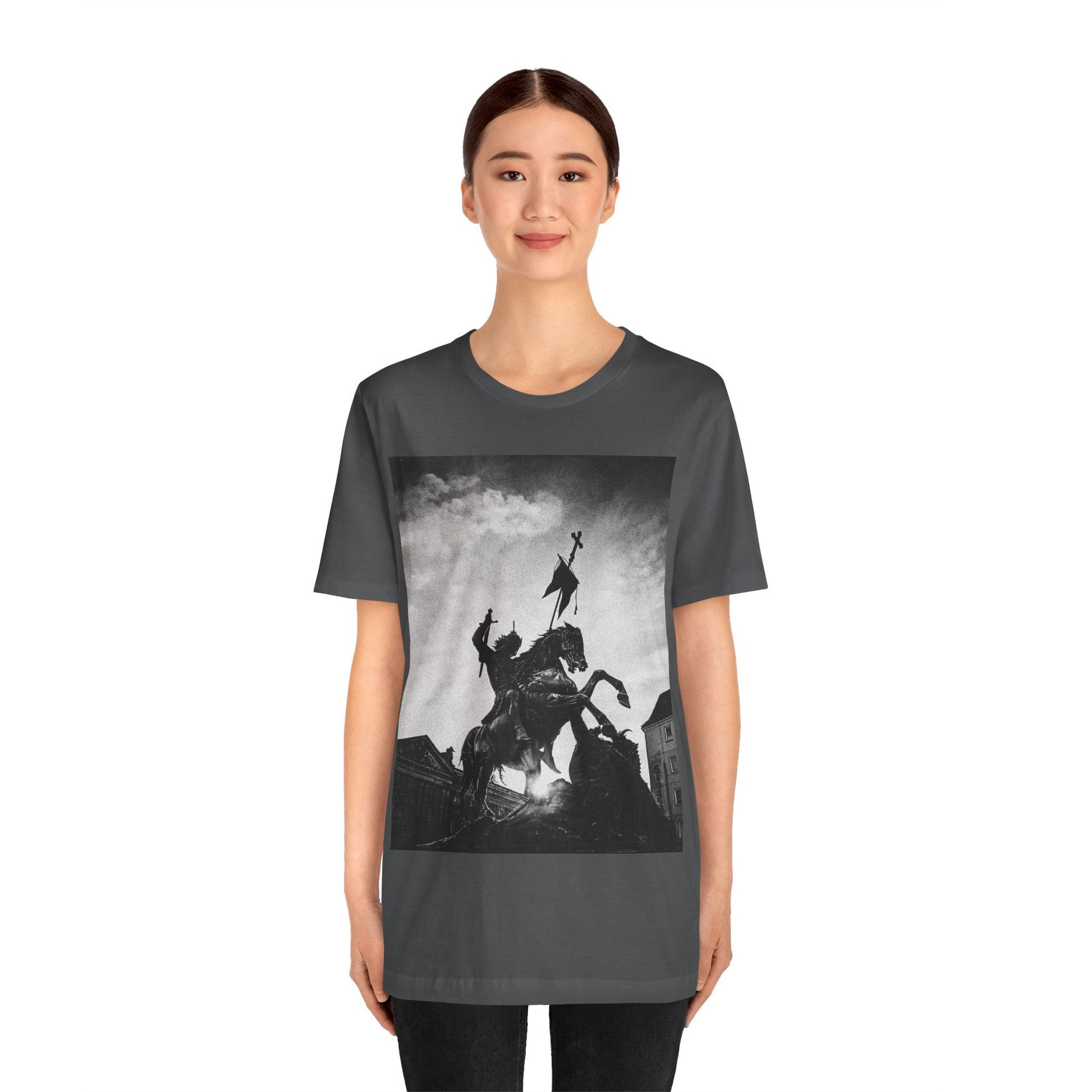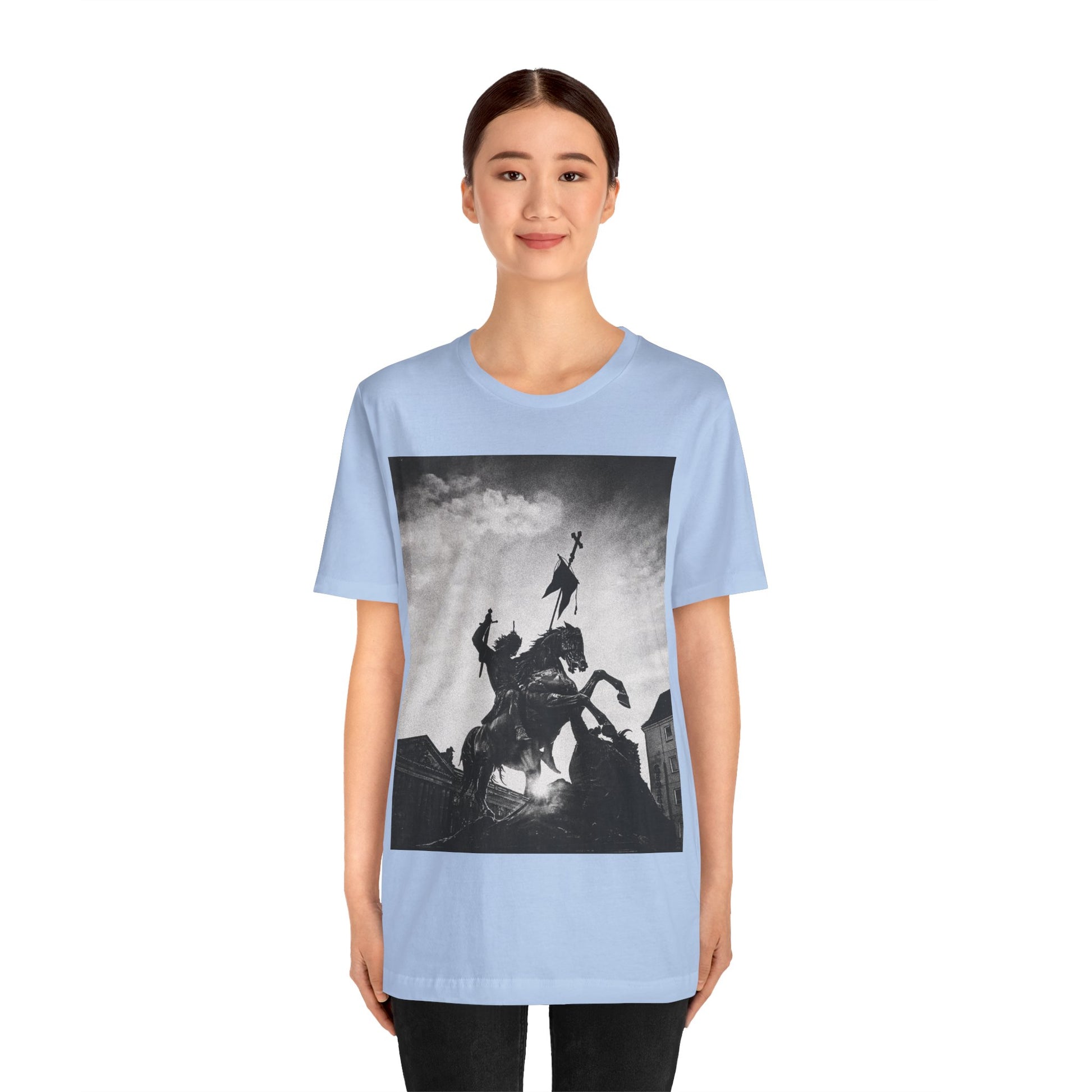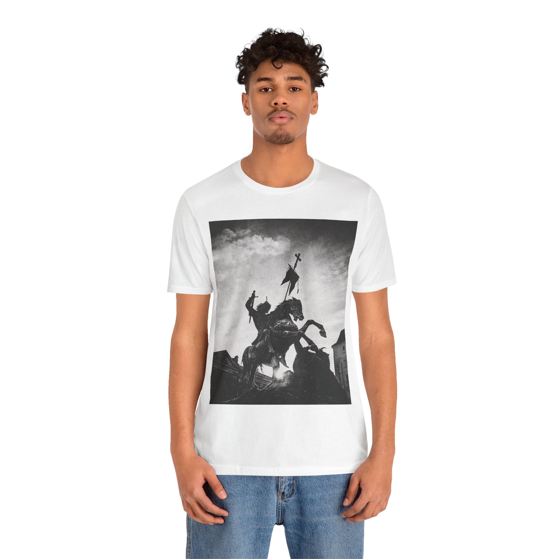 This lightweight cotton tee carries a striking black-and-white statue print that feels both timeless and bold. The image of a mounted figure with a raised banner creates a dramatic silhouette against a wintry sky, giving the shirt a cinematic, artful edge. Wear it layered under a jacket for city wandering or alone on warm afternoons — it reads like a quiet statement piece for someone who appreciates historical imagery, monochrome aesthetics, and understated impact. The retail crew neckline and clean cut let the artwork speak while keeping the look polished and wearable.