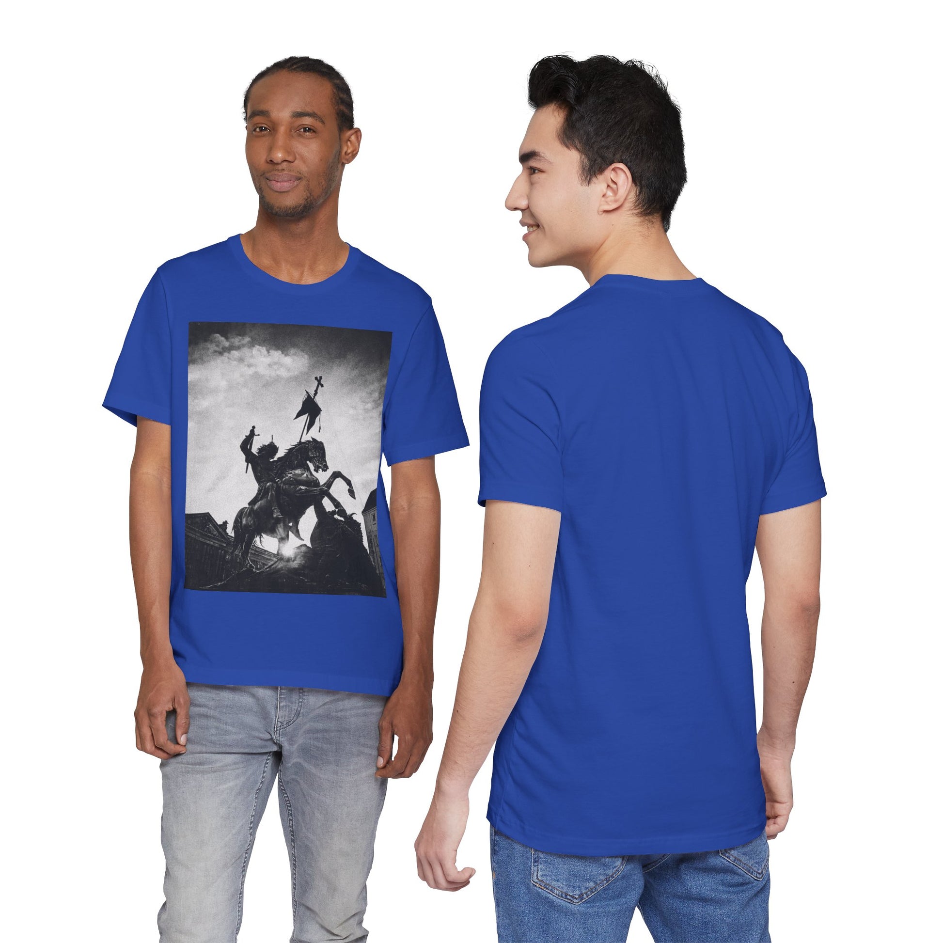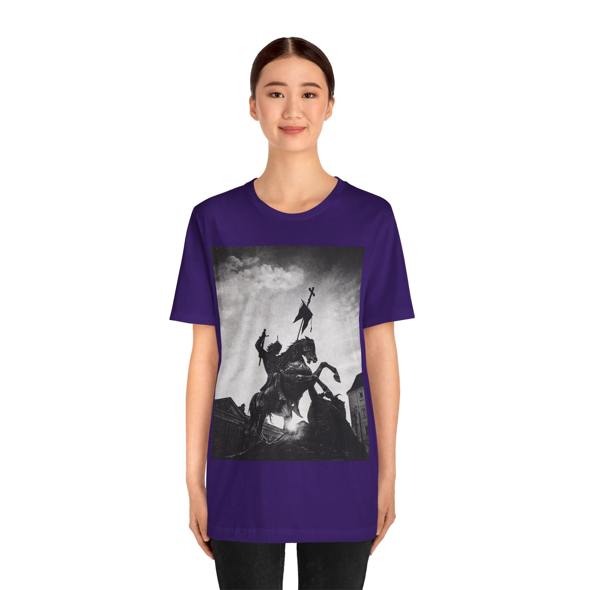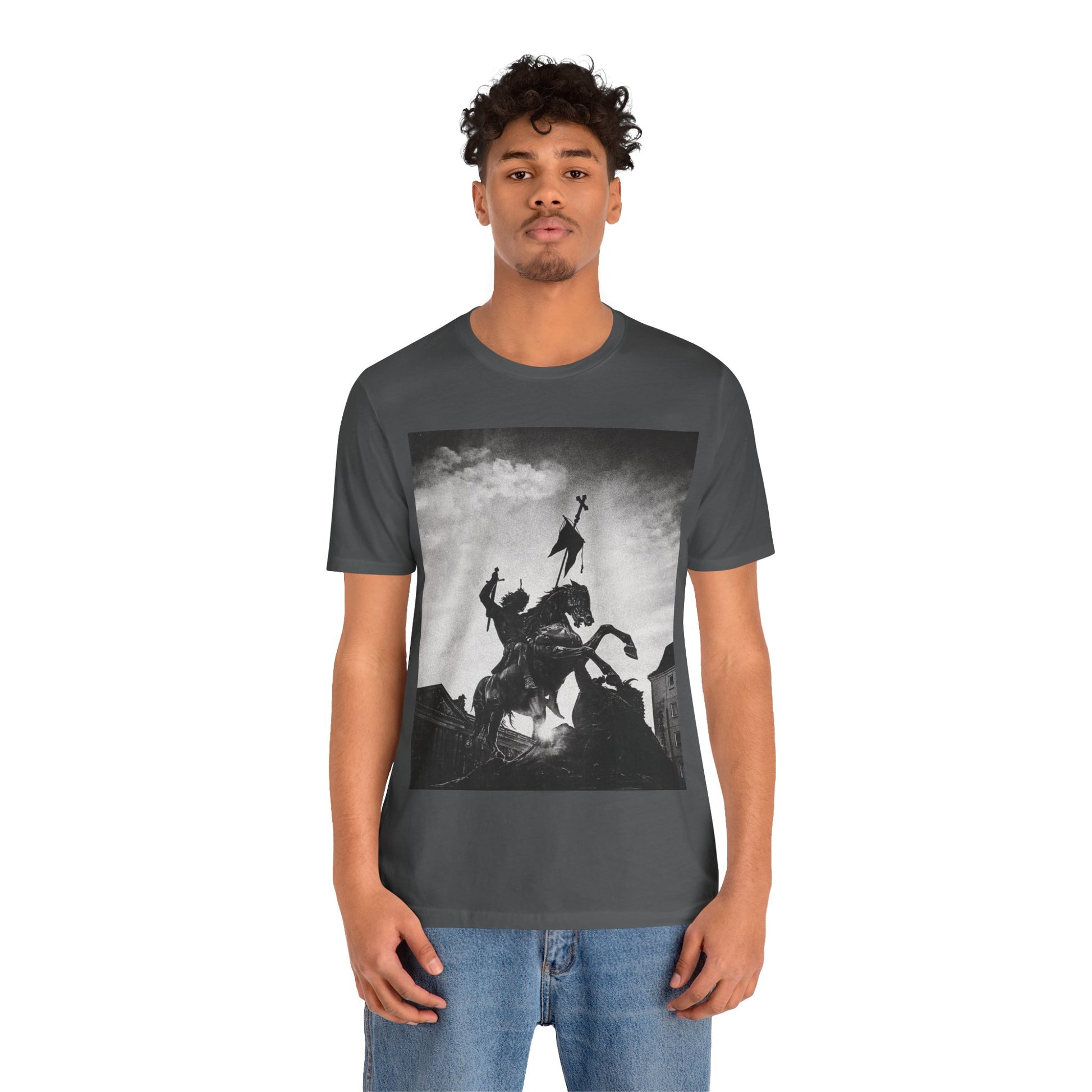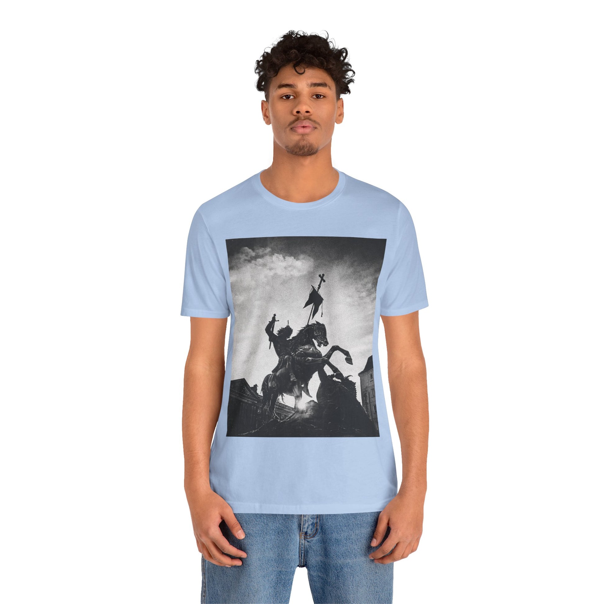 This lightweight cotton tee carries a striking black-and-white statue print that feels both timeless and bold. The image of a mounted figure with a raised banner creates a dramatic silhouette against a wintry sky, giving the shirt a cinematic, artful edge. Wear it layered under a jacket for city wandering or alone on warm afternoons — it reads like a quiet statement piece for someone who appreciates historical imagery, monochrome aesthetics, and understated impact. The retail crew neckline and clean cut let the artwork speak while keeping the look polished and wearable.