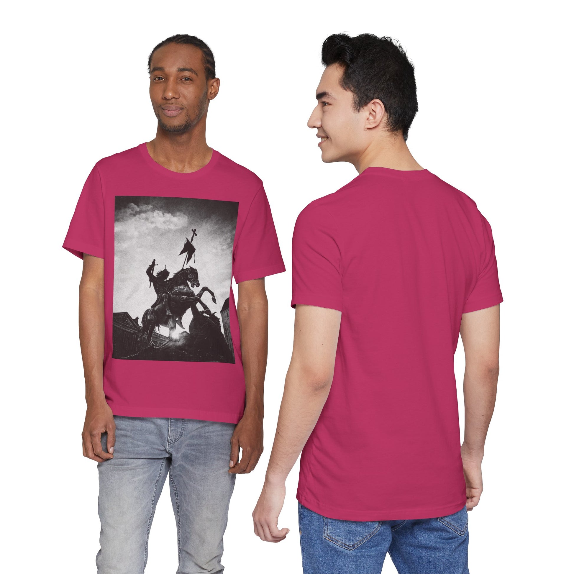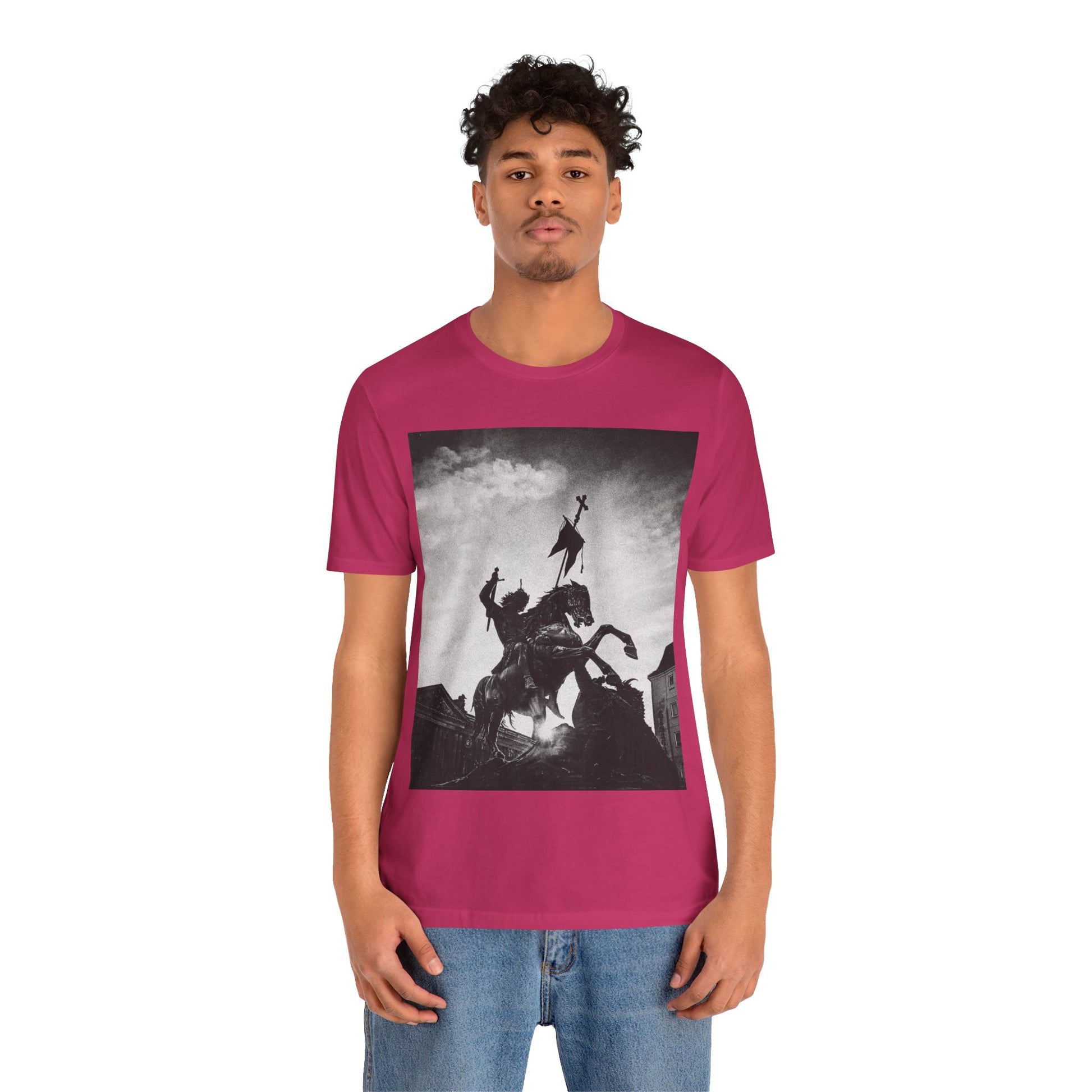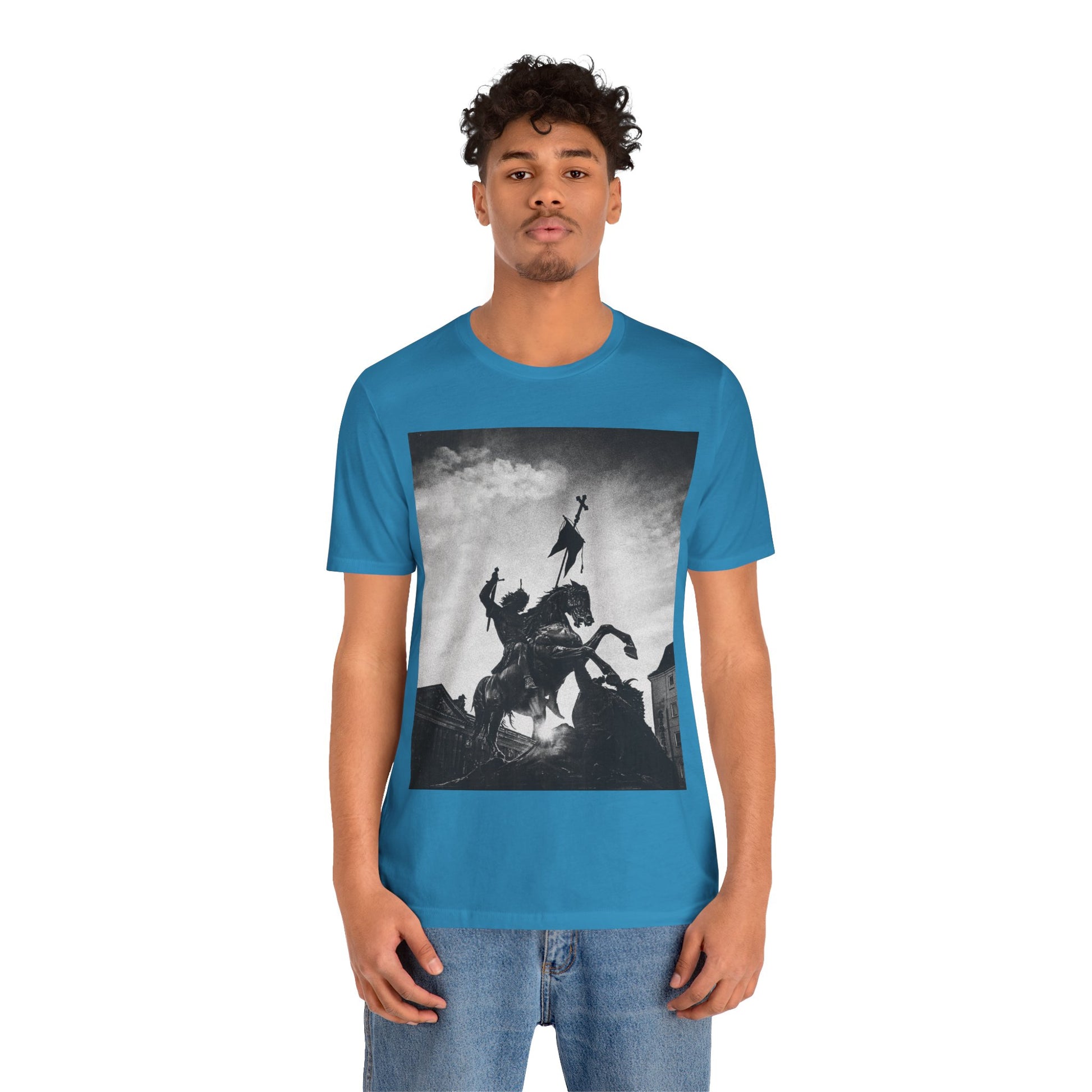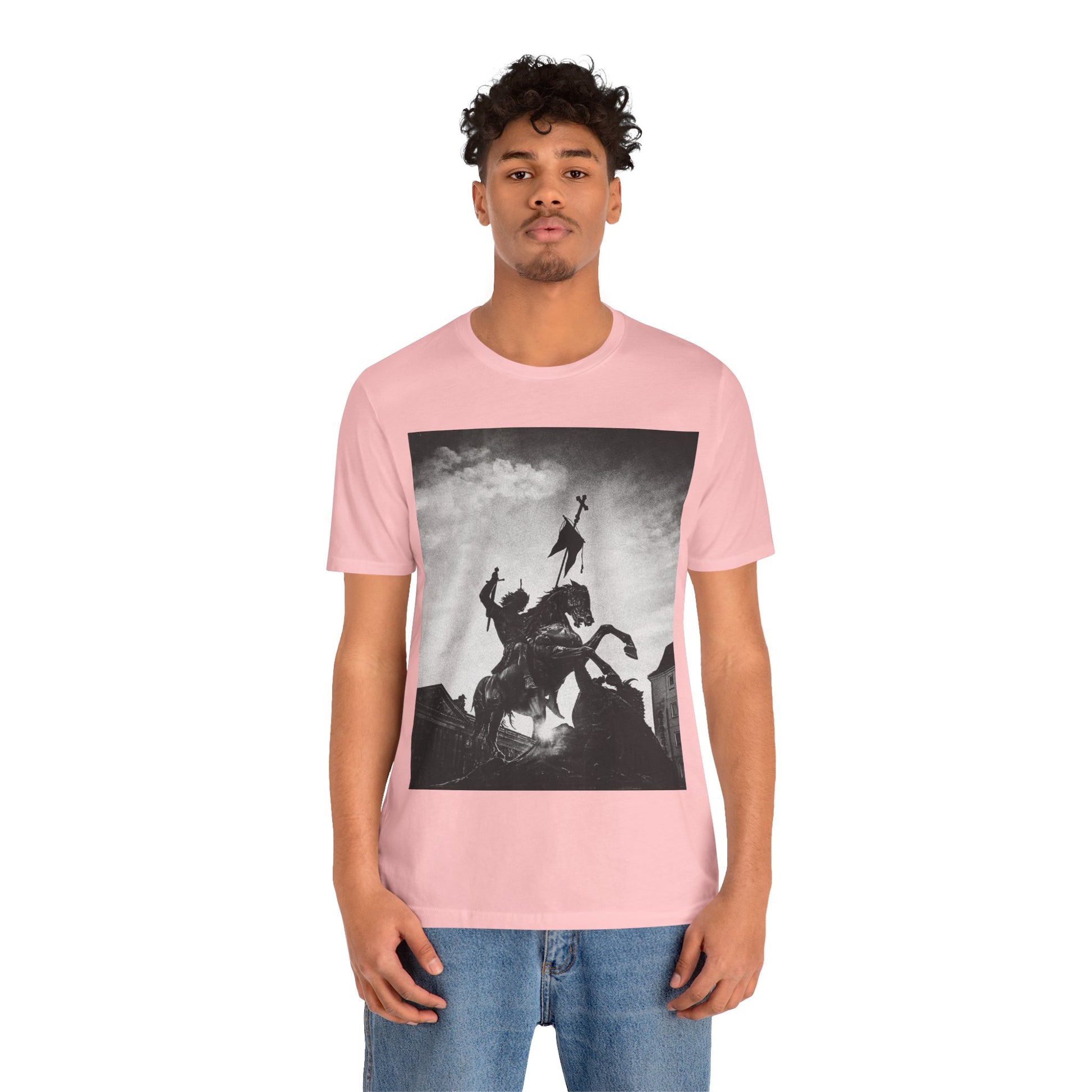 This lightweight cotton tee carries a striking black-and-white statue print that feels both timeless and bold. The image of a mounted figure with a raised banner creates a dramatic silhouette against a wintry sky, giving the shirt a cinematic, artful edge. Wear it layered under a jacket for city wandering or alone on warm afternoons — it reads like a quiet statement piece for someone who appreciates historical imagery, monochrome aesthetics, and understated impact. The retail crew neckline and clean cut let the artwork speak while keeping the look polished and wearable.